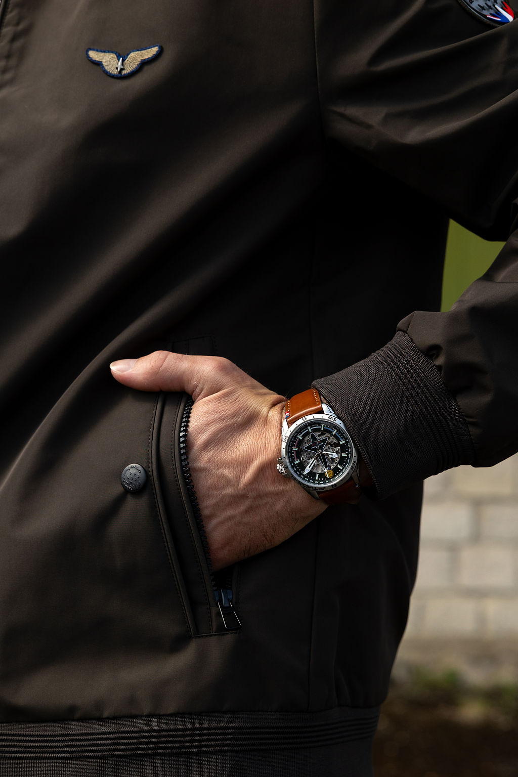 La découpe inversée d’un Alphat Jet sur le cadran de notre Montre Automatique Athos 8 fait écho aux avions profilés de la PAF.
