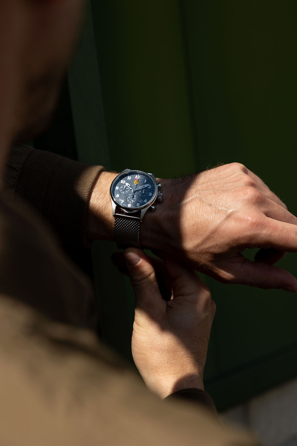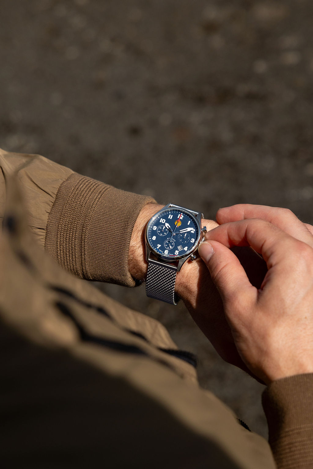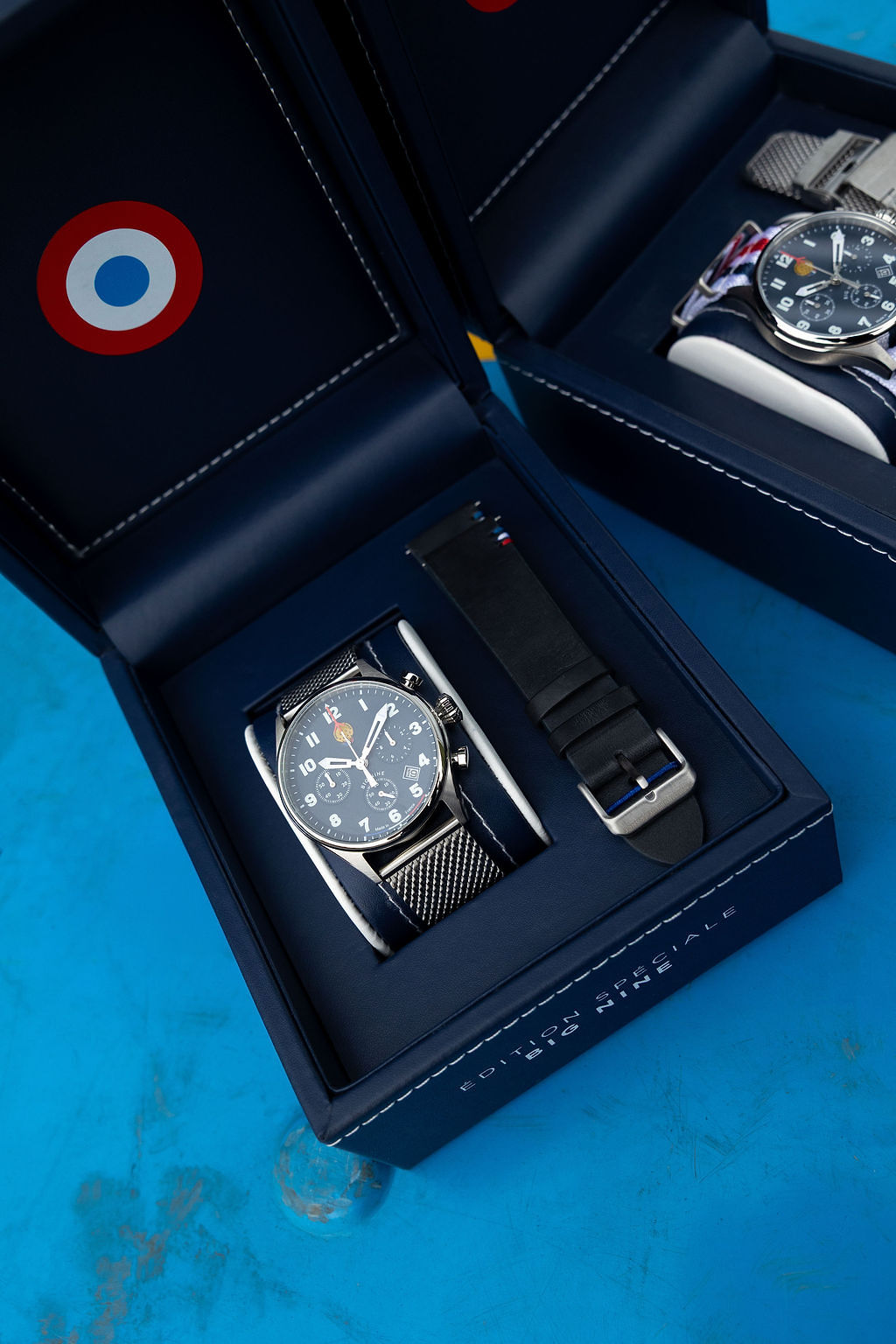 En raison des avancées aéronautiques, le 17 mai 1981, l’Alpha Jet succède au Fouga Magister au sein de la Patrouille de France. Véritable star de la Grande Dame, ce biréacteur, par sa maniabilité, excelle dans le domaine de la voltige aérienne et du vol en formation. Les pilotes s’en sont fait un complice et leur duo opère en parfaite harmonie. Sa silhouette familière se dessine dans le ciel comme sur nos cadrans et laisse sa trace tricolore à chaque représentation.