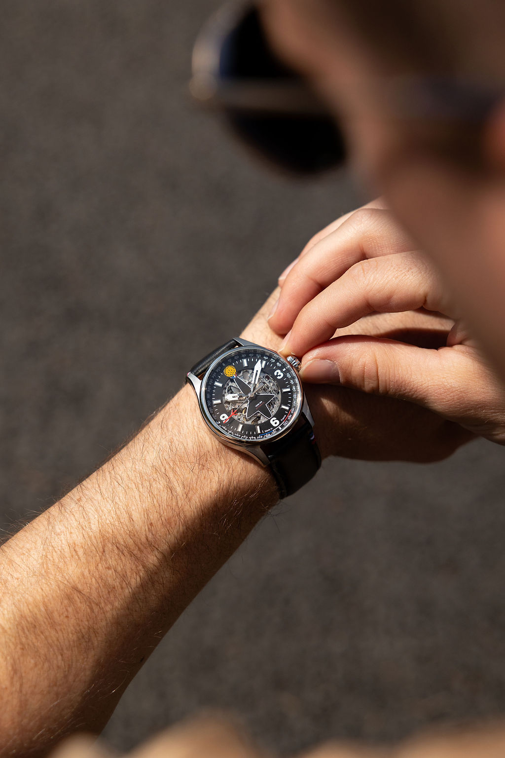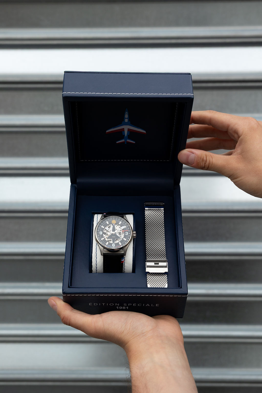 En raison des avancées aéronautiques, le 17 mai 1981, l’Alpha Jet succède au Fouga Magister au sein de la Patrouille de France. Véritable star de la Grande Dame, ce biréacteur, par sa maniabilité, excelle dans le domaine de la voltige aérienne et du vol en formation. Les pilotes s’en sont fait un complice et leur duo opère en parfaite harmonie. Sa silhouette familière se dessine dans le ciel comme sur nos cadrans et laisse sa trace tricolore à chaque représentation.
