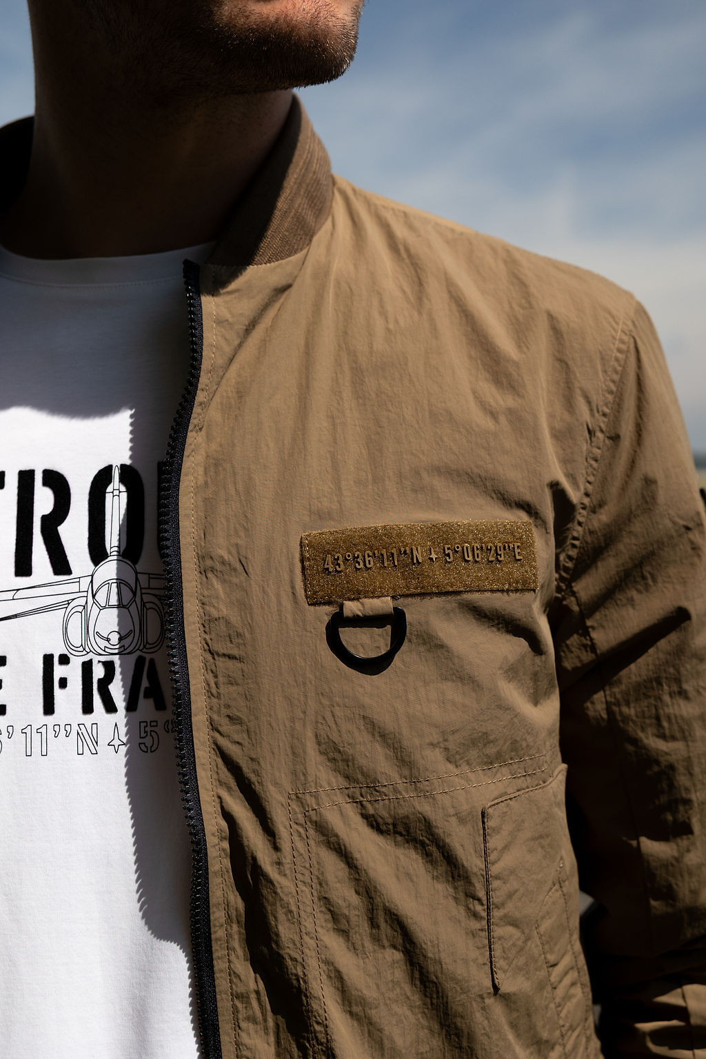 Pièce à manches TIGER AERO en coton, zip central, 2 poches à rabats latérales avec un boutton de pression, logo PATROUILLE DE FRANCE au niveau de l'épaule droite, poche zipée arrondie au niveau de l'épaule gauche, petit drapeau français brodé sous la poche arrondie.