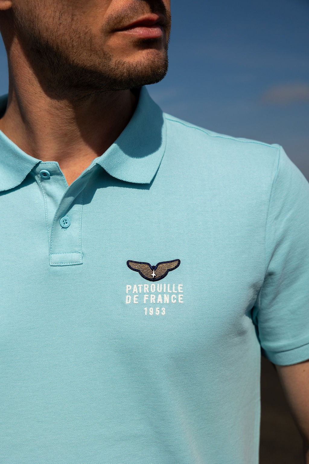 Polo FIRST CLUB en coton et polyester, col à revers, 2 boutons d'attaches, logo PATROUILLE DE FRANCE brodé côté coeur, 2 fentes cotés en bas du polos, petit drapeau français attaché au polo en bas à droite,