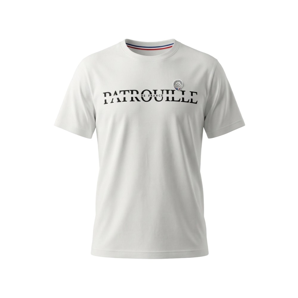 Ses finitions contrastées — col à bandes, manches soulignées et broderie cœur — évoquent la rigueur et le souci du détail propres à la Patrouille de France.